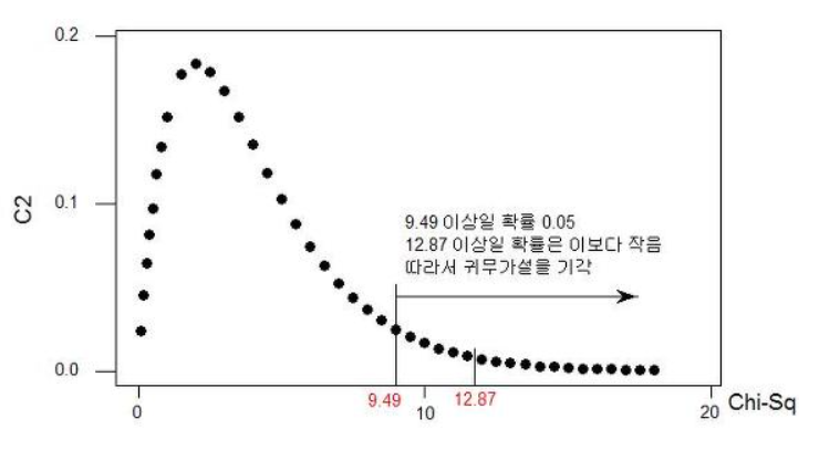 12.87 > 9.49 로 귀무가설을 기각 할 수 있습니다.