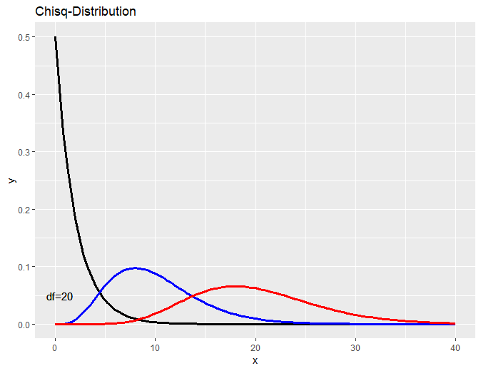 검정색 선은 자유도(df, degree of freedom)가 2일 때, 파란색 선은 df=10, 빨간선은 df=20일 때이다.