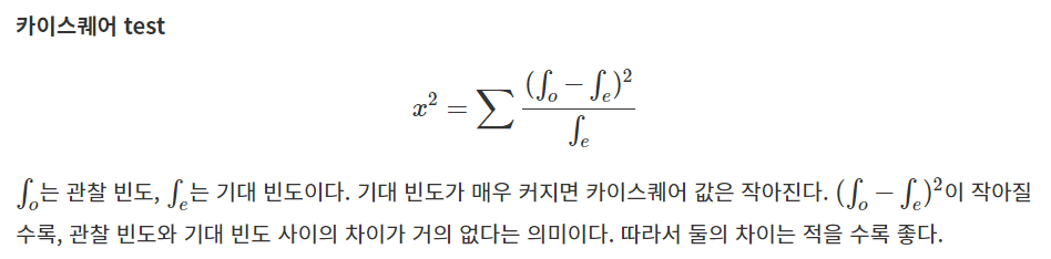 위 식을 바탕으로 아래의 카이스퀘어를 범주별로 구할 수 있습니다.