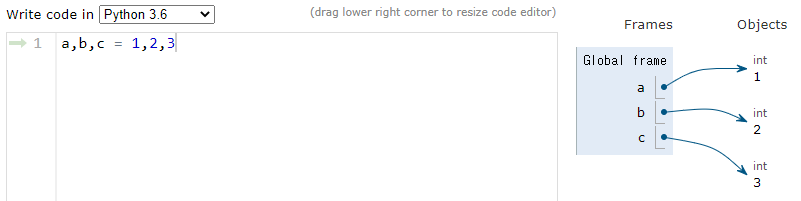 그림과 같이 "a,b,c = 1,2,3" 으로 콤마로 구분해 주면 변수 여러 개를 한번에 만들수 있다