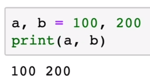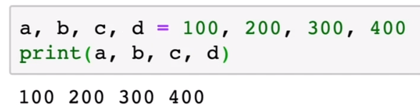 >>> a, b, c = [1, 2, 3] >>> print(a, b, c) 1 2 3 >>> d, e, f = (4, 5, 6) >>> print(d, e, f) 4 5 6