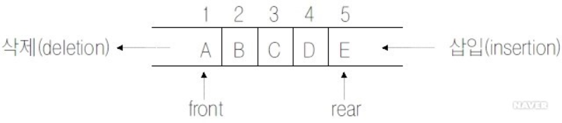 리스트의 한쪽 끝에서만 삽입과 삭제가 일어나는 스택과는 달리 리스트의 한쪽 끝에서는 원소들이 삭제되고 반대쪽 끝에서는 원소들의 삽입만 가능하게 만든 순서화된 리스트. 가장 먼저 리스트에 삽입된 원소가 가장 먼저 삭제되므로 선입 선출(先入先出)인 FIFO(first in first out) 리스트라고 한다.