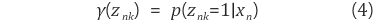 GMM을 이용한 classification은 주어진 데이터 xnxn에 대해 이 데이터가 어떠한 Gaussian distribution에서 생성되었는지를 찾는 것이다. 이를 위해 responsibility γ(znk)γ(znk)를 [식 4]와 같이 정의한다.