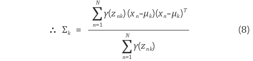 이를 위해 각각의 πk,μk,Σkπk,μk,Σk에 대해 L(X;θ)L(X;θ)를 편미분한다. Log-likelihood를 최대화하기 위한 μkμk의 추정 과정은 아래와 같다.