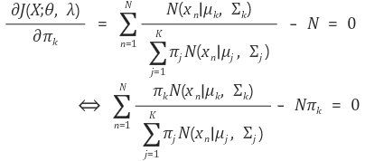 GMM의 마지막 parameter인 πkπk는 [식 3]의 조건을 만족하면서 log-likelihood를 최대화해야 한다. 따라서, πkπk는 라그랑주 승수법 (Lagrange multiplier method)을 이용하여 추정하며, 라그랑지안 J(X;θ,λ)J(X;θ,λ)는 [식 9]와 같다