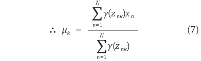[식 4]에서 znk∈{0,1}znk∈{0,1}는 xnxn이 주어졌을 때 GMM의 kk번째 Gaussian distribution이 선택되면 1, 아니면 0의 값을 갖는 binary variable이다. 즉, znkznk가 1이라는 것은 xnxn이 kk번째 Gaussian distribution에서 생성되었다는 것을 의미한다. GMM을 이용한 classification은 xnxn이 주어졌을 때, kk개의 γ(znk)γ(znk)를 계산하여 가장 값이 높은 Gaussian distribution을 선택하는 것이다.