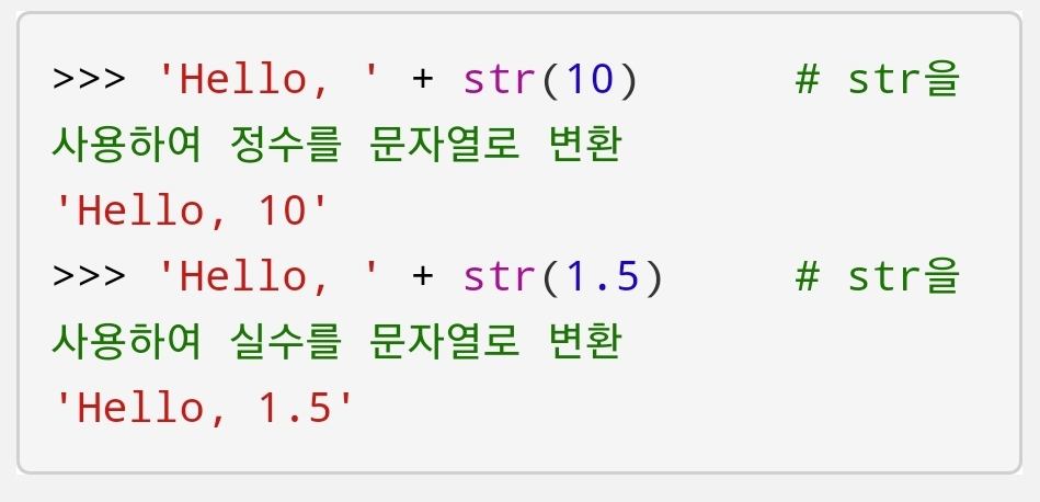 'Hello, ' + str(10)과 같이 str을 사용하여 10을 문자열로 변환한 뒤 'Hello, '와 연결했습니다. 즉, 문자열에 +를 사용할 때는 어떤 형태의 값이든 str을 사용해서 문자열로 맞춰주면 됩니다. 특히 이 방식은 파이썬에서 자주 사용하는 방식인데요. 문자열과 숫자를 간단하게 조합할 수 있어서 계산 결과와 설명을 함께 출력할 때 편리합니다.