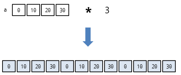 요소 0, 10, 20, 30이 들어있는 리스트를 3번 반복해서 새 리스트를 만들었습니다.