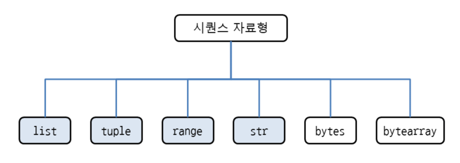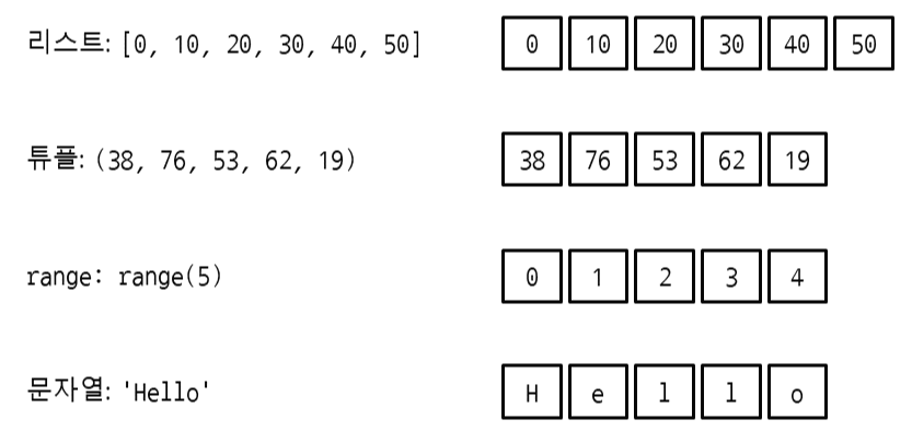 파이썬에서는 리스트, 튜플, range, 문자열처럼 값이 연속적으로 이어진 자료형을 시퀀스 자료형(sequence types)라고 부릅니다.