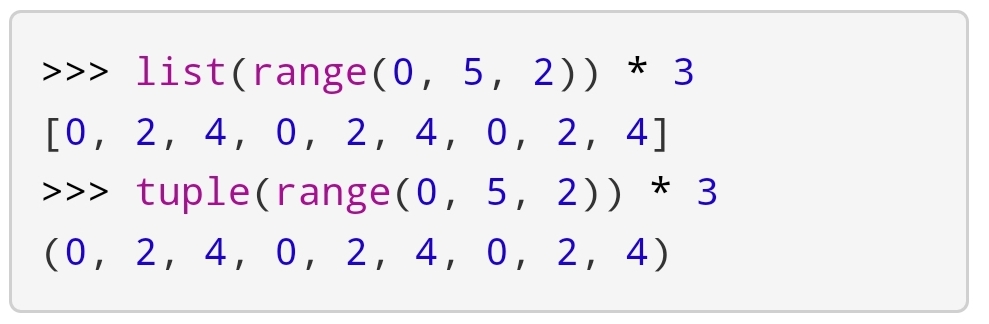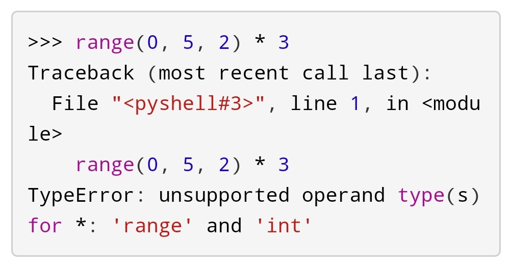 앞에서 range는 + 연산자로 객체를 연결할 수 없었죠? 마찬가지로 range는 * 연산자를 사용하여 반복할 수 없습니다.