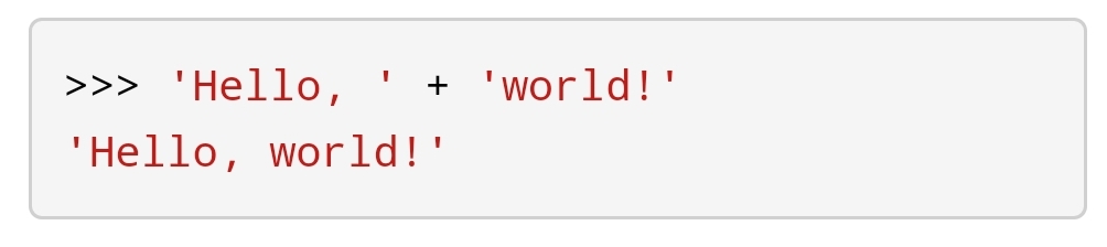 따옴표로 묶은 문자열 'Hello, '와 'world!'를 연결하여 'Hello, world!'가 나왔습니다. 파이썬에서 문자열 연결은 여러 가지 결과를 묶어서 한 번에 출력할 때 자주 사용합니다.
