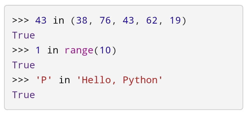 시퀀스 객체에 in 연산자를 사용했을 때 특정 값이 있으면 True, 없으면 False가 나옵니다. 따라서 리스트 a에 30이 있으므로 True, 100이 없으므로 False가 나옵니다.