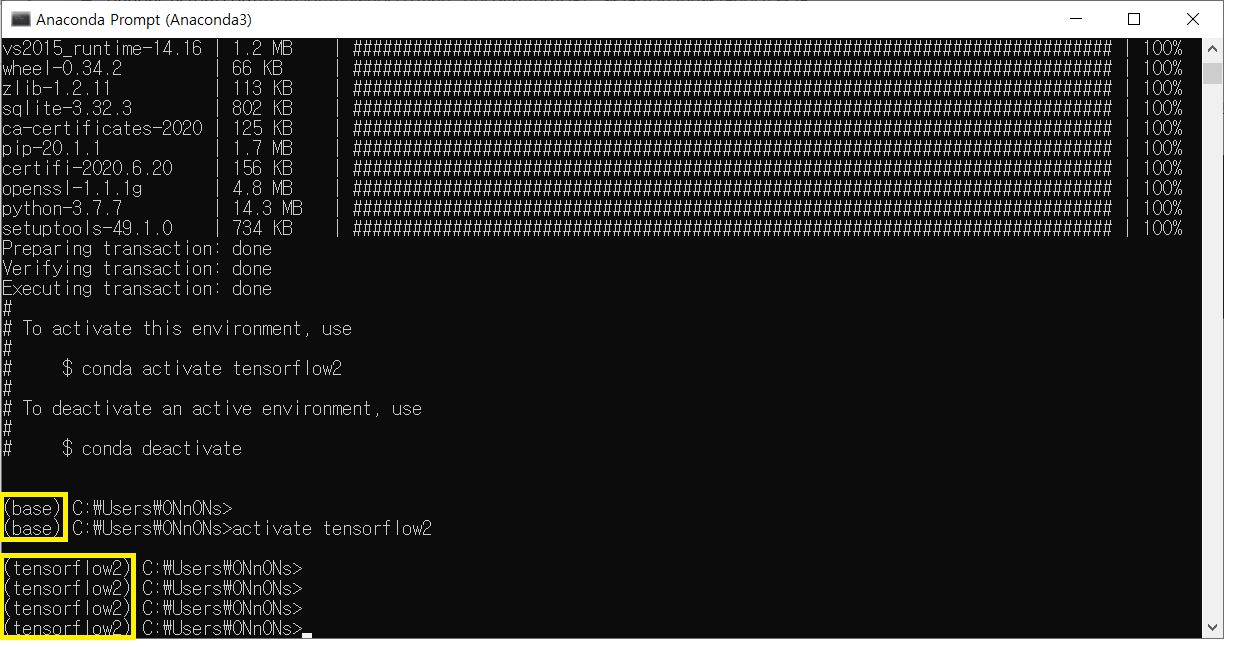 좌측에 base 에서 tensorflow2 로 바뀐것을 확인 할 수 있다
