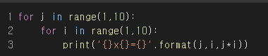 그럼 .format ( j , i , j * i ) 는 서로 반복하며 곱하게 된다
