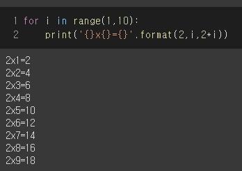 .format( 2 , i , 2 * i ) 를 순서대로 { } x { } = { } 에 대입이 된다
