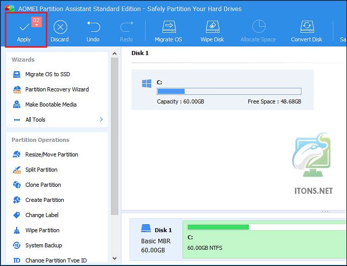 그러면 C 드라이브 하나로 병합되어 있는 것으로 보이지만 실제는 아직 미 적용되어 있으므로 Apply 메뉴를 선택합니다.