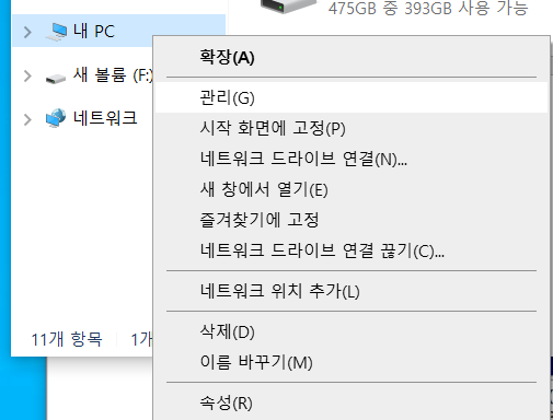 디스크 관리는 내 PC 마우스 오른쪽 버튼을 눌러 관리->저장소->디스크 관리로 들어가거나 Win+R 키를 눌러 diskmgmt.msc 입력 후 엔터를 누르면 됩니다.