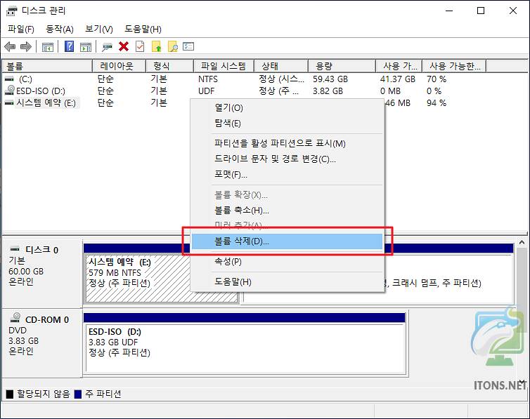 재부팅하여 시스템 예약 파티션 마우스 오른쪽 버튼을 눌러 볼륨 삭제 메뉴를 선택합니다. 그럼 또 다른 메시지가 뜨는데 그땐 예 버튼을 누르면 됩니다.