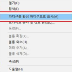 디스크 관리로 들어가서 C 드라이브 마우스 오른쪽 버튼을 눌러 파티션을 활성 파티션으로 표시 메뉴를 선택합니다.