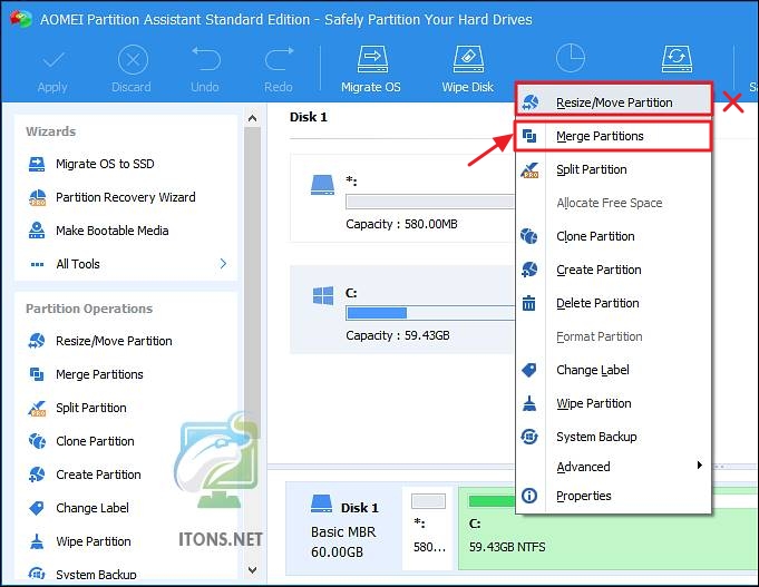 설치한 AOMEI Partition Assistant 프로그램을 실행하여 C 드라이브 마우스 오른쪽 버튼을 눌러 Merge Partitions 메뉴를 선택합니다.