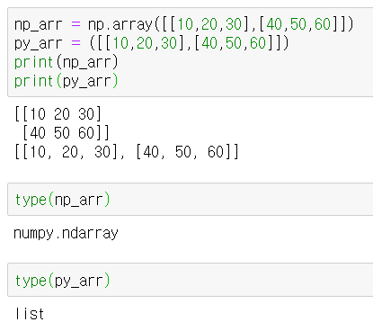- numpy에서는 array() 함수를 통해 배열 생성(numpy 객체)