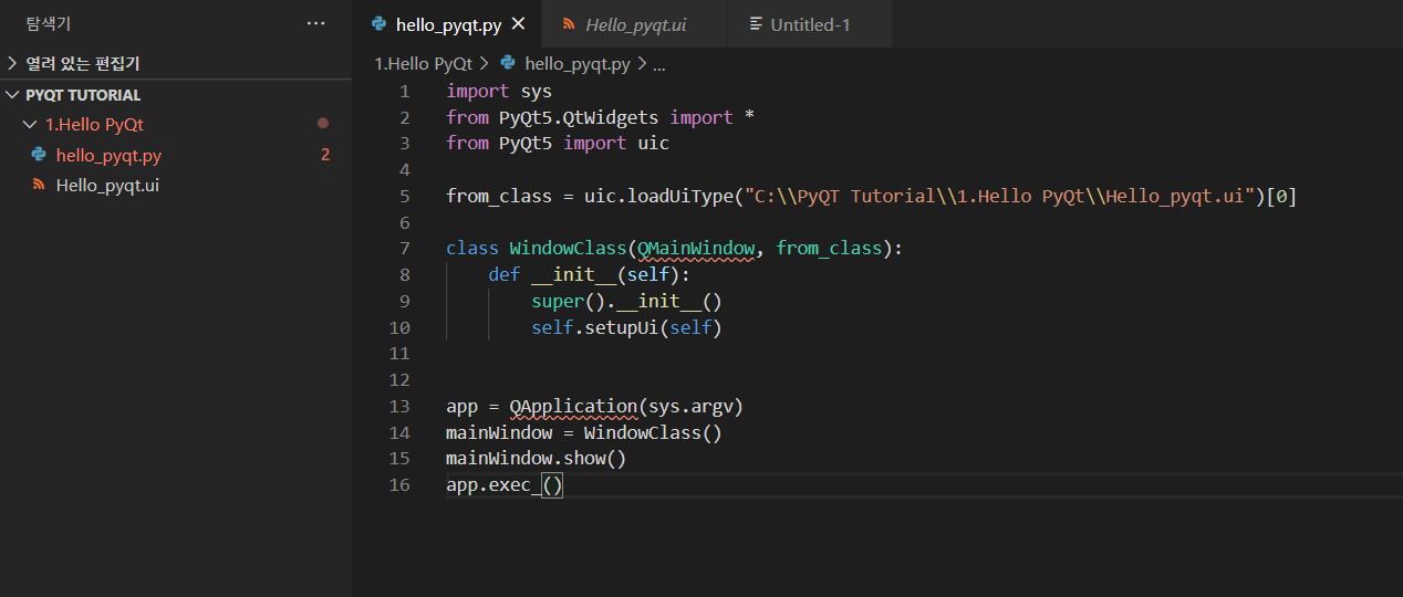 폴더 열기를 통하여 PyQt 를 저장한 폴더로 열어준다