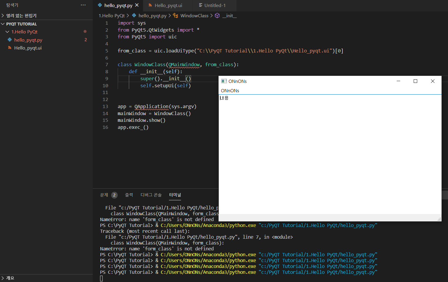 VScode 와 PyQt 가 연결된 것을 확인 할 수 있다