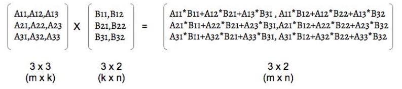 즉 axb 행렬과 mxn 행렬이 있을때, 이 두 행렬을 곱하려면 b와 m이 같아야 한다.