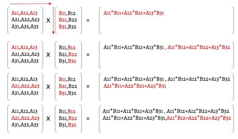 이렇게 앞 행렬의 행과 열을 곱해나가면 결과적으로 아래와 같은 결과가 나온다.
