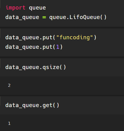 - LifoQueue(): 나중에 입력된 데이터가 먼저 출력되는 구조 (스택 구조라고 보면 됨)