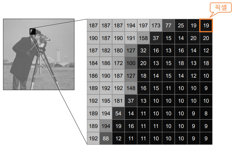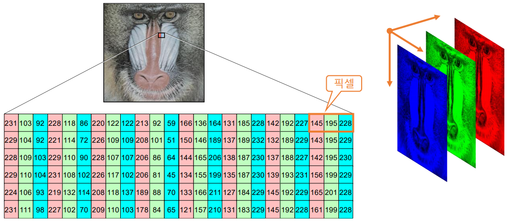 • 픽셀: 영상의 기본 단위, picture element, 화소(畵素)