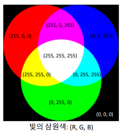 • R, G, B 색 성분의 크기를 각각 0 ~ 255 범위의 정수로 표현