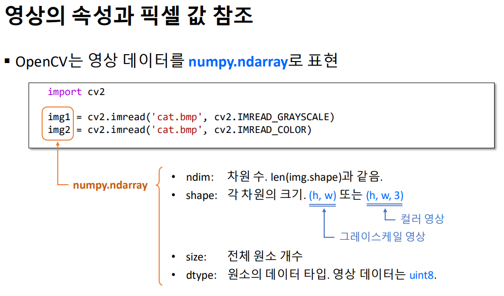 • 그레이스케일 영상: cv2.CV_8UC1 → numpy.uint8, shape = (h, w)