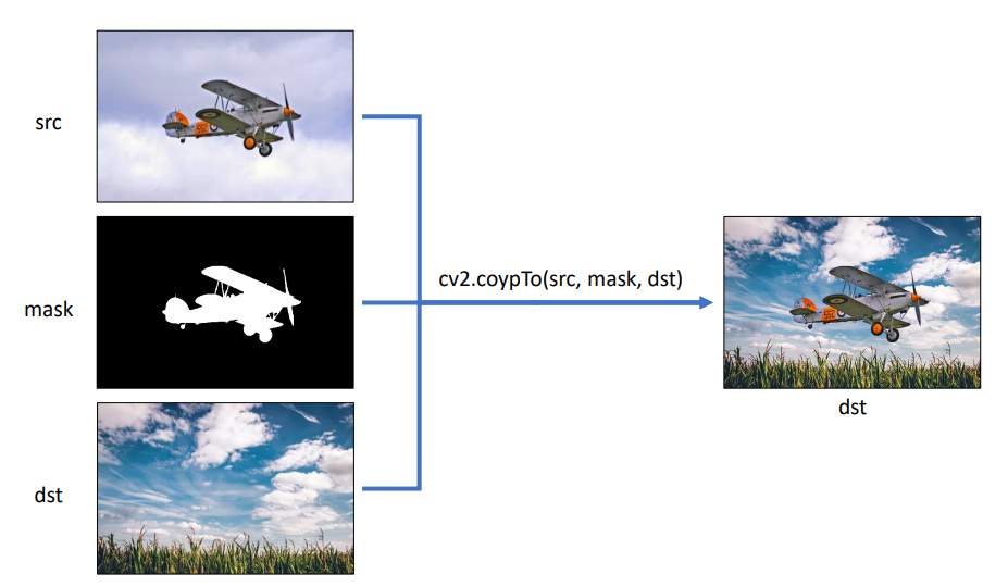 • mask: 마스크 영상. cv2.CV_8U. (numpy.uint8) 0이 아닌 픽셀에 대해서만 복사 연산을 수행.