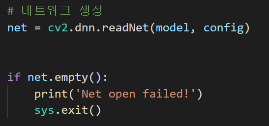 network 생성을 readNet 함수를 통해서 모델 파일링 콘피그파일링 네트워크 개체 넷이 생성이 됨