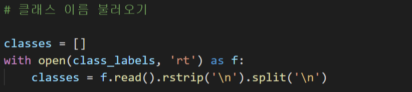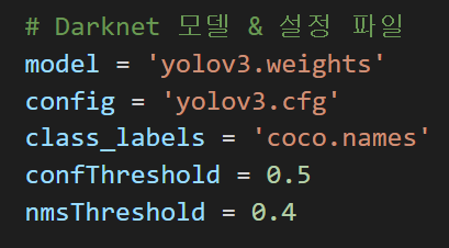 confThreshold = 0.5 # class 의 확률값이 0.5 이상인 값의 bounding box 에 대해서만 취합함