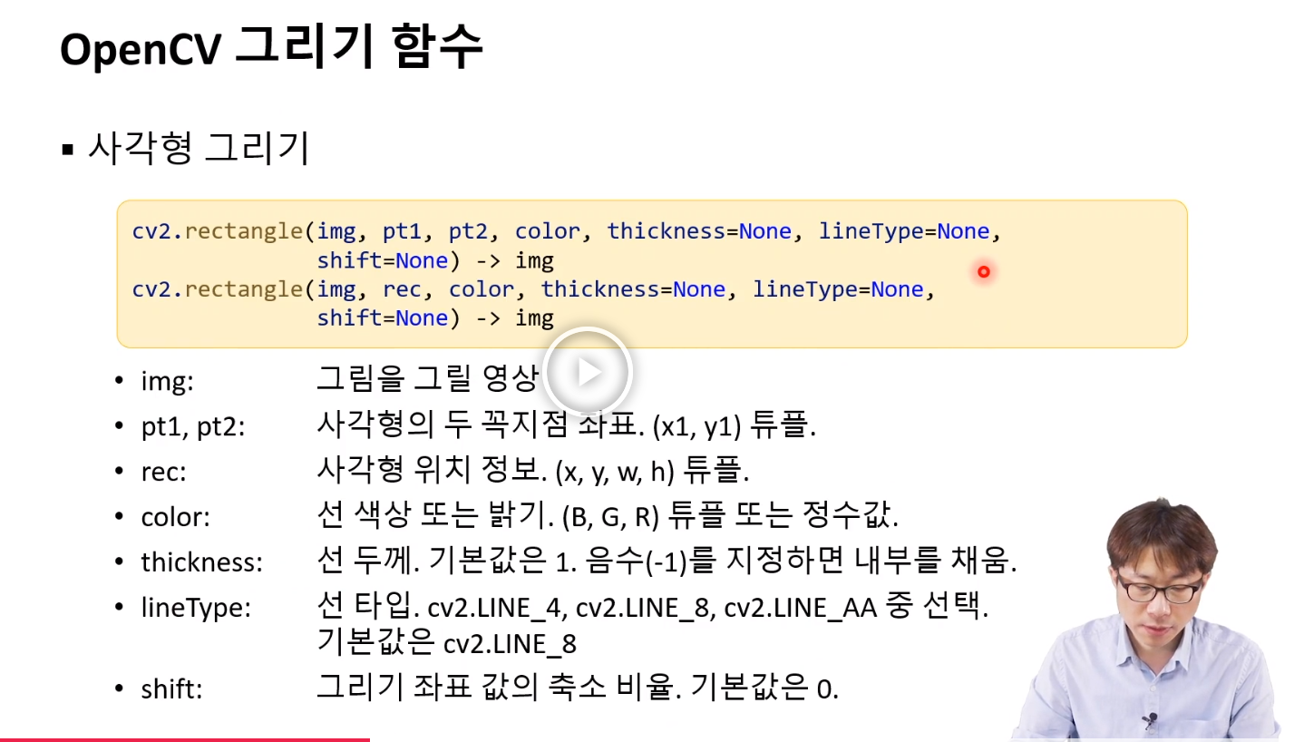 • img: 그림을 그릴 영상 • pt1, pt2: 사각형의 두 꼭지점 좌표. (x, y) 튜플. • rec: 사각형 위치 정보. (x, y, w, h) 튜플. • color: 선 색상 또는 밝기. (B, G, R) 튜플 또는 정수값. • thickness: 선 두께. 기본값은 1. 음수(-1)를 지정하면 내부를 채움. • lineType: 선 타입. cv2.LINE_4, cv2.LINE_8, cv2.LINE_AA 중 선택. 기본값은 cv2.LINE_8 • shift: 그리기 좌표 값의 축소 비율. 기본값은 0.