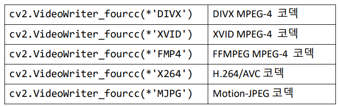 • OpenCV에서는 cv2.VideoWriter 클래스를 이용하여 일련의 프레임을 동영상 파일로 저장할 수 있음