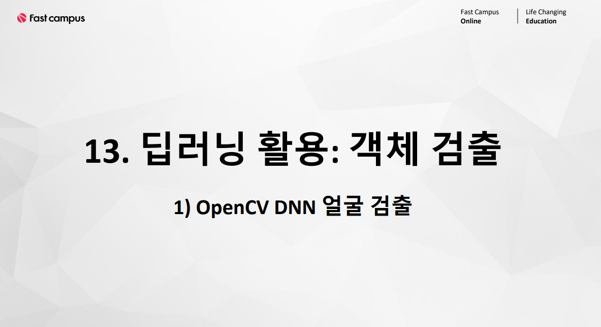 OpenCV DNN 얼굴 검출 ▪ OpenCV DNN 얼굴 검출 예제 • OpenCV 예제에서 DNN 모듈을 사용한 얼굴 검출 기능을 지원 ▪ SSD(Single Shot MultiBox Detector) 기반 얼굴 검출 네트워크 ▪ https://github.com/opencv/opencv/tree/master/samples/dnn/face_detector • 기존의 Haar-Cascade 방법보다 속도 & 정확도 면에서 더 좋은 성능을 나타냄