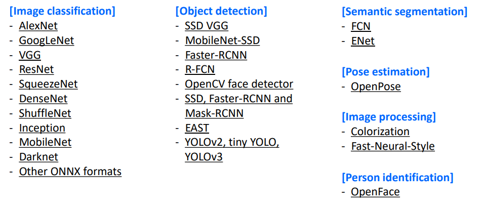 • 미리 학습된 딥러닝 모델을 이용하여 실행(forward pass, inference) 하는 기능