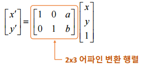 어파인 변환 행렬(동차적 표계 개념)을 적용하면 이동 변환을 하나의 행렬로 표현할 수 있습니다.